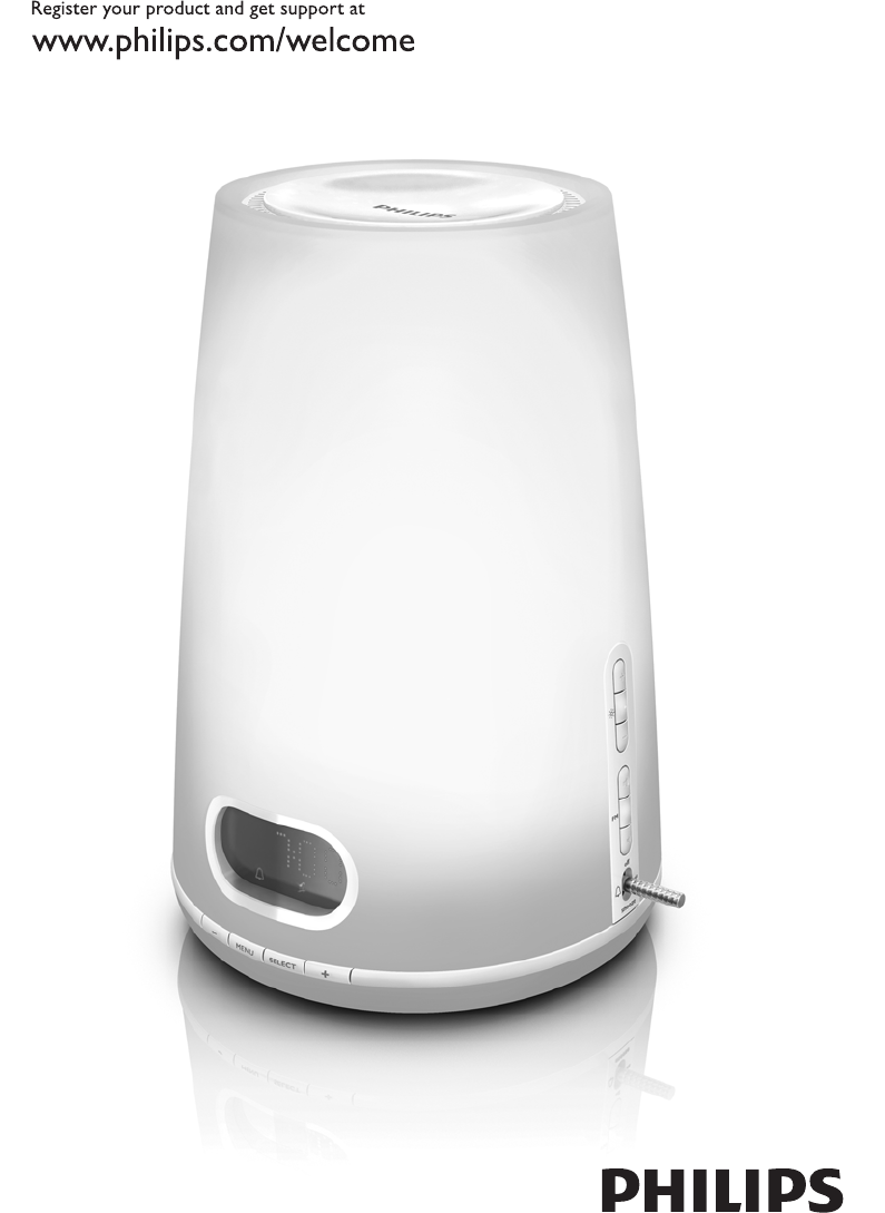 English Introduction Congratulations on your purchase and welcome to Philips! To fully benefit from the support that Philips offers, register your product at www.philips.com/welcome. The Philips Wake-up Light helps you wake up more pleasantly. The light intensity of the lamp gradually increases to the set level in the 30 minutes before the set wake-up time. The light gently prepares your body for waking up at the set time.