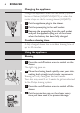 14 English Question Answer Why doesn’t the shaver switch on when I press the on/off button? The battery may be empty. Recharge the battery (see chapter ‘Charging’). Simply reattach the shaving unit by pressing it The shaving unit onto the shaver (see chapter ‘Replacement’, has come off the shaver. What should item 5).