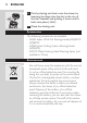 English 13 Disposal of the battery Only remove the battery if it is completely empty. 1 Remove the powerplug from the wall socket and pull the appliance plug out of the shaver. 2 Let the shaver run until it stops, undo the screws and open the shaver. 3 Remove the battery. Do not connect the shaver to the mains again after the battery has been removed. Guarantee & service If you need information or if you have a problem, please visit the Philips website at www.philips.