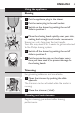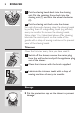 English Using the appliance Shaving 1 Put the appliance plug in the shaver. 2 Put the mains plug in the wall socket. 3 Switch on the shaver by pushing the on/off slide to position I. 4 Move the shaving heads quickly over your skin, making both straight and circular movements. Shaving on a dry face gives the best results. Your skin may need 2 or 3 weeks to get accustomed to the Philips shaving system. 5 Switch off the shaver by pushing the on/off slide to position 0.