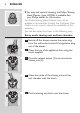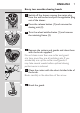 English Every two months: shaving heads 1 Switch off the shaver, remove the mains plug from the wall socket and pull the appliance plug out of the shaver. 2 1 2 2 Press the release button (1) and remove the shaving unit (2). 3 Turn the wheel anticlockwise (1) and remove the retaining frame (2). 1 4 Remove the cutters and guards and clean them with the brush supplied. Do not clean more than one cutter and guard at a time, since they are all matching sets.