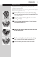 English Replacement Replace the shaving heads every two years for optimal shaving results. Replace damaged or worn shaving heads with HQ55 Philips Shaving Heads only. 1 Switch off the shaver, remove the mains plug from the wall socket and pull the appliance plug out of the shaver. 2 1 2 2 Press the release button (1) and remove the shaving unit (2). 3 Turn the wheel anticlockwise (1) and remove the retaining frame (2). 1 4 Remove the shaving heads and place new ones in the shaving unit.