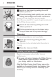 70 Português 5 Limpe a unidade de corte com o lado curto da escova. Escove cuidadosamente na direcção da seta. 6 Escove a guarda. 1 2 7 Volte a colocar as cabeças na unidade de corte.Volte a colocar a armação de fixação na unidade de corte (1) e rode o anel para a direita (2). 8 Volte a colocar a unidade de corte na máquina de barbear. Para uma limpeza mais profunda, limpe as cabeças de corte colocando-as num líquido desengordurante (como álcool) de 6 em 6 meses.
