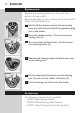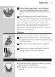 English You can also clean the shaver in the following way: Every week: shaving unit and hair chamber 1 Switch off the shaver, remove the mains plug from the wall socket and pull the appliance plug out of the shaver. 2 Clean the top of the appliance first, using the brush supplied. 3 Press the release button (1) and remove the shaving unit (2). 2 1 4 Clean the inside of the shaving unit and the hair chamber with the brush. 5 Put the shaving unit back onto the shaver.