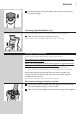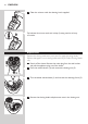 Lietuviškai 51 4 Nuimkite skutimo galvutes (skutimo ir apsaugines) po vieną ir išvalykite jas pateiktu šepetėliu. Pastaba.Vienu metu nevalykite daugiau nei vienos skutimo ir apsauginės galvutės, nes jas reikia įstatyti į jų originalias vietas. Jei netyčia supainiosite galvutes, gali prireikti kelių savaičių, kol prietaisas vėl veiks tinkamai. 5 Valykite skutiklį trumpais šepetėlio šereliais. Atsargiai braukite rodyklės kryptimi. 6 Nuvalykite apsauginį elementą.