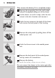 Português 79 1 Desligue a máquina de barbear, retire a ficha de alimentação da tomada eléctrica e puxe a ficha do aparelho para fora da máquina. 2 Prima o botão de libertação para abrir a unidade de corte. 3 Rode o bloqueio para a esquerda (1) e retire a armação de fixação (2). 4 Retire as cabeças e coloque as cabeças novas na unidade de corte.Volte a colocar a armação de fixação na unidade de corte e rode o bloqueio para a direita.