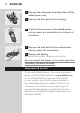 Deutsch 31 2 Drücken Sie die Entriegelungstaste, und öffnen Sie die Schereinheit. 3 Drehen Sie die Verriegelung gegen den Uhrzeigersinn (1), und entnehmen Sie den Scherkopfhalter (2). 4 Entnehmen Sie die Scherköpfe, und setzen Sie neue Scherköpfe in die Schereinheit ein. Setzen Sie den Scherkopfhalter wieder in die Schereinheit, und drehen Sie die Verriegelung im Uhrzeigersinn fest. Die Vorsprünge an den Scherköpfen müssen genau in die Aussparungen der Schereinheit passen. 5 Schließen Sie die Schereinheit.