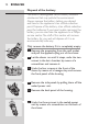 English 11 2 Press the release button to open the shaving unit. 3 Turn the lock anticlockwise (1) and remove the retaining frame (2). 4 Remove the shaving heads and place new ones in the shaving unit. Put the retaining frame back into the shaving unit and turn the lock clockwise. Make sure that the projections of the shaving heads fit exactly into the recesses. 5 Close the shaving unit. Accessories The following accessories are available: - HQ8500/HQ8000 powerplug. - HQ8 Philips Shaving Heads.