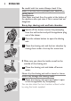 8 English Be careful with hot water. Always check if the water is not too hot, to prevent your hands from getting burnt. Note:Water may leak from the socket at the bottom of the appliance when you rinse it.This is normal and not dangerous. Every day: shaving unit and hair chamber 1 Switch off the shaver, remove the powerplug from the wall socket and pull the appliance plug out of the shaver. 2 Press the release button to open the shaving unit.