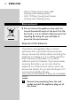 12 ENGLISH - HQ101 Philips Action Clean refill (shaving head cleaning liquid). - HQ110 Philips shaving head cleaner (shaving head cleaning spray). Environment not throw the appliance away with the C ◗ Do normal household waste at the end of its life, but hand it in at an official collection point for recycling. By doing this you will help to preserve the environment. Disposal of the batteries The built-in rechargeable battery contains substances that may pollute the environment.