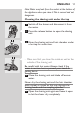 English 11 Note:Water may leak from the socket at the bottom of the appliance when you rinse it.This is normal and not dangerous. Cleaning the shaving unit under the tap 1 Switch off the shaver and disconnect it from the mains. 2 Press the release button to open the shaving unit. 3 Rinse the shaving unit and hair chamber under a hot tap for some time. - Make sure that you clean the inside as well as the outside of the shaving unit. Be careful with hot water.