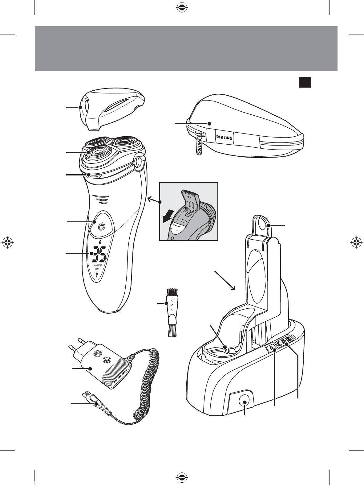 8 ENGLISH Compliance with standards - The shaver complies with the internationally approved IEC safety regulations and can be safely cleaned under the tap. - The shaver and the Jet Clean system comply with all standards regarding electromagnetic fields (EMF). If handled properly and according to the instructions in this user manual, the appliances are safe to use based on scientific evidence available today. General - The adapter transforms 100-240 volts to a safe low voltage of less than 24 volts.