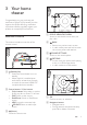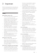 2 Important Read and understand all instructions before you use your product. If damage is caused by failure to follow instructions, the warranty does not apply. • • Safety Risk of electric shock or fire! • Never expose the product and accessories to rain or water. Never place liquid containers, such as vases, near the product. If liquids are spilt on or into the product, disconnect it from the power outlet immediately. Contact Philips Consumer Care to have the product checked before use.