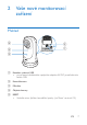 2 Vaše nové monitorovací zařízení Přehled d e c a b a Konektor rozhraní USB • pro připojení dodávaného napájecího adaptéru AC/DC prostřednictvím kabelu USB b Kontrolka stavu c Mikrofon d Objektiv kamery e RESET • Stiskněte otvor špičkou kancelářské sponky (viz 'Reset' na straně 15).