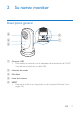 2 Su nuevo monitor Descripción general d e c a b a Conector USB • Para realizar la conexión con el adaptador de alimentación de CA/CC suministrado a través de un cable USB b Indicador de estado c Micrófono d Lente de la cámara e RESET • Presione el orificio con la punta de un clip (consulte 'Reiniciar' en la página 16).