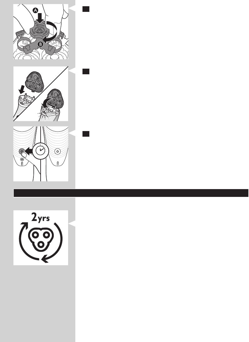 7 Umístěte zajišťovací rámeček zpět do holicí jednotky (A) a otočte