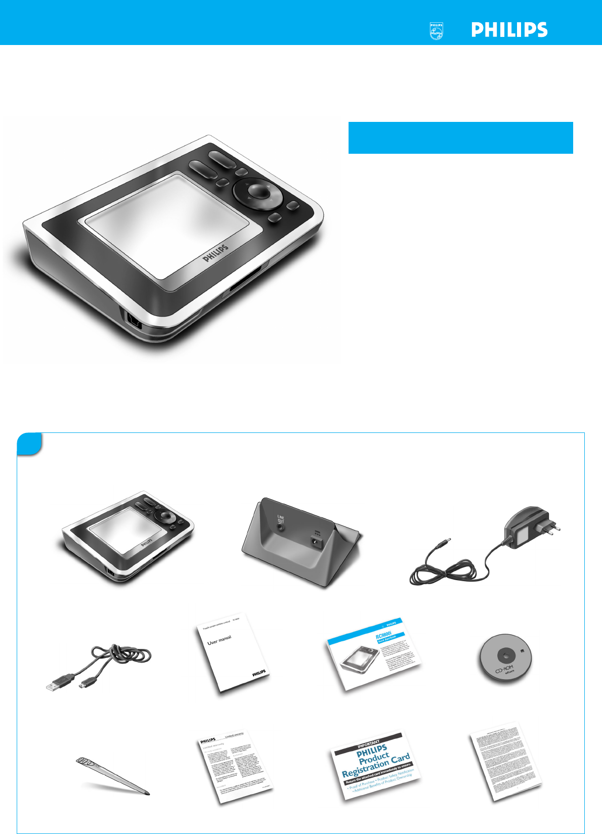 A caixa do telecomando de ecrã táctil RC9800i contém os seguintes itens: