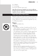 ENGLISH Problem Possible cause Solution The shaver is not entirely clean after I clean it in the SmartClean system. You have not placed the shaver in the SmartClean system properly, so there is no electrical connection between the SmartClean system and the shaver. Press down the top cap (‘click’) to ensure a proper connection between the shaver and the SmartClean system. The cleaning cartridge is empty. The replacement symbol flashes to indicate you have to replace the cleaning cartridge.