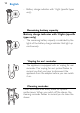 English 20 6 Clean the cutter and guard under the tap. 7 Put the cutter back into the guard. 8 Place the shaving heads in the shaving head holder. Note: Make sure that the projections of the shaving heads fit exactly into the recesses. 1 2 9 Place the retaining rings back onto the shaving head holder and turn them clockwise ('click').