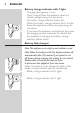 ENGLISH 1 Remove the screw in the back panel with a screwdriver. Then remove the back panel. 2 Bend the hooks aside and remove the power unit. 3 Break the snap hooks and remove the front panel of the power unit. 4 Take out the battery holder and cut the battery tags with a pair of cutting pliers. Guarantee and support If you need information or support, please visit www.philips.com/support or read the separate worldwide guarantee leaflet.