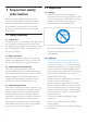 •• If you have recently tanned, see section ‘Stay out of the sun’ below. D Note: If you have any questions or need advice, contact the Philips skincare expert team. 1.3.3 Where not to use the device •• Within the bony rim around the eye. •• In areas other than face, neck, chest, hands or forearms. •• On nipples, areolas, labia minora, vagina and anus. •• Inside ears, nose or mouth or on lips. •• Over or near implants or on or near piercings or jewelry or other metals attached to the body. 1.