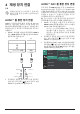 동글 연결 동 글 ( 예 : Amazon Fire Stick, Roku Stick 또 는 Chromecast) 을 프로젝터에 연결하여 인터넷으로 비디오를 쉽게 볼 수 있습니다 . 연결하면 투사 화면에 이미지가 표시되고 프로젝터에서 오디오가 재생됩니다 . 1 2 HDMI™ 케이블을 사용하여 동글을 프로젝터의 HDMI 2(ARC) 포트에 연결하십시오 . 5 외부 스피커 또는 헤드폰 연결 외부 스피커 또는 헤드폰을 프로젝터에 연결할 수 있습니다 . 연결하면 프로젝터의 오디오가 외부 스피커 또는 헤드폰을 통해 재생됩니다 . • USB 케 이 블 을 사 용 하 여 동 글 을 프 로 젝 터 의 USB-A 포트에 연결하십시오 . 외부 스피커 또는 헤드폰을 프로젝터에 연결하면 내부 스피커가 자동으로 비활성화됩니다 . 위험 ! 청력 손상 위험 ! 헤드폰을 연결하기 전에 프로젝터의 볼륨을 줄이십시오 . 특히 헤드폰을 사용할 때는 볼륨을 높인 채로 프로젝터를 장시가 사용하지 마십시오 .