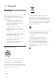 1 Fontos! Biztonság Ez a kézikönyv fontos információkat tartalmaz a Philips beltéri televízióantennához. Az üzembehelyezés és a beállítás előtt olvassa el figyelmesen. • A terméket óvja a rácsepegő vagy ráfröccsenő folyadékoktól, illetve ne helyezzen rá folyadékot tartalmazó edényeket, például vázát. • A tápellátás akkor van teljesen lecsatlakoztatva, ha a termék hálózati csatlakozódugója ki van húzva a fali aljzatból.