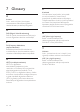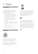 Sisällysluettelo 60 Turvallisuus 60 Kierrätys 60 2 SDV5118 -laite Yleiskuvaus 3 Aloitus Asentaminen 4 Asenna SDV5118 61 61 62 62 63 VHF/FM-vastaanotto 63 UHF-vastaanotto 63 Käyttäminen digitaalisen virittimen kanssa 64 5 Usein kysytyt kysymykset 65 6 Takuu- ja huoltotiedot 65 7 Glossary 66 Su omi 1 Tärkeää FI 59