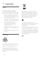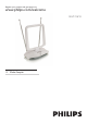 1 Important Safety Ce manuel contient des informations importantes sur l’antenne de télévision d’intérieur Philips. Lisez-le attentivement avant de commencer l’installation et la configuration. • L’appareil ne doit pas être exposé aux fuites et aux éclaboussures. Aucun objet rempli de liquide, par exemple un vase, ne doit être placé sur l’appareil. • Pour couper complètement l’alimentation, débranchez la prise secteur de l’appareil.