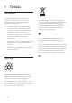 Sisällysluettelo 4 Turvallisuus 4 Kierrätys 4 2 SDV5118 -laite Yleiskuvaus 3 Aloitus Asentaminen 4 Asenna SDV5118 5 5 6 6 7 VHF/FM-vastaanotto 7 UHF-vastaanotto 7 Käyttäminen digitaalisen virittimen kanssa 8 5 Usein kysytyt kysymykset 9 6 Takuu- ja huoltotiedot 9 7 Glossary 10 S uo mi 1 Tärkeää FI 3