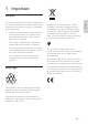 1 Important Sécurité • L’appareil ne doit pas être exposé aux fuites et aux éclaboussures. Aucun objet rempli de liquide, par exemple un vase, ne doit être placé sur l’appareil. • Pour couper complètement l’alimentation, débranchez la prise secteur de l’appareil. • Si la fiche d’alimentation secteur est utilisée comme dispositif de sectionnement, celle-ci doit rester facilement accessible. • Aucune flamme nue, par exemple une bougie allumée, ne doit être placée sur l’appareil.