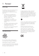 1 Fontos! Biztonság Ez a kézikönyv fontos információkat tartalmaz a Philips beltéri televízióantennához. Az üzembehelyezés és a beállítás előtt olvassa el figyelmesen. • A terméket óvja a rácsepegő vagy ráfröccsenő folyadékoktól, illetve ne helyezzen rá folyadékot tartalmazó edényeket, például vázát. • A tápellátás akkor van teljesen lecsatlakoztatva, ha a termék hálózati csatlakozódugója ki van húzva a fali aljzatból.