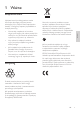1 Ważne Bezpieczeństwo • Nie narażaj urządzenia na kontakt z wilgocią ani kapiącą lub rozlaną wodą. Nie stawiaj na nim jakichkolwiek przedmiotów wypełnionych płynami, np. wazonów. • Aby całkowicie odłączyć zasilanie, wyjmij wtyczkę urządzenia z gniazdka elektrycznego. • Jeśli urządzenie jest podłączone do gniazdka elektrycznego za pomocą wtyczki, musi ona być łatwo dostępna. • Nie stawiaj na urządzeniach źródeł otwartego ognia, np. zapalonych świec.