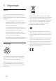 1 Important Safety This manual contains important information about the Philips indoor television antenna. Read it carefully before you start the installation and setup. • The product shall not be exposed to dripping or splashing and that no objects filled with liquids, such as vases, shall be placed on the product. • To completely disconnect the power input, the mains plug of the product shall be disconnected from the mains.