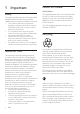 1 Important Safety This manual contains important information about the Philips indoor television antenna. Read it carefully before you start the installation and setup. • The product shall not be exposed to dripping or splashing and that no objects filled with liquids, such as vases, shall be placed on the product. • To completely disconnect the power input, the mains plug of the product shall be disconnected from the mains.