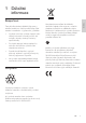 1 Důležité informace Tato příručka obsahuje důležité informace o televizní anténě pro vnitřní použití Philips. Před instalací a nastavením si ji pozorně si ji přečtěte. • Výrobek nesmí být vystaven kapající nebo stříkající tekutině a nesmějí na něm být umístěny objekty obsahující tekutiny, například vázy. • Pro úplné odpojení zdroje napájení by měla být síťová šňůra výrobku zcela odpojena ze zásuvky.