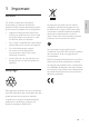 1 Important Sécurité • L’appareil ne doit pas être exposé aux fuites et aux éclaboussures. Aucun objet rempli de liquide, par exemple un vase, ne doit être placé sur l’appareil. • Pour couper complètement l’alimentation, débranchez la prise secteur de l’appareil. • Si la fiche d’alimentation secteur est utilisée comme dispositif de sectionnement, celle-ci doit rester facilement accessible. • Aucune flamme nue, par exemple une bougie allumée, ne doit être placée sur l’appareil.
