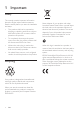 1 Important Safety This manual contains important information about the Philips indoor television antenna. Read it carefully before you start the installation and setup. • The product shall not be exposed to dripping or splashing and that no objects filled with liquids, such as vases, shall be placed on the product. • To completely disconnect the power input, the mains plug of the product shall be disconnected from the mains.