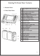 Contents I Getting to know your camera 1. Camera views 1.1 Rear panel view 1.2 Top and front camera view 2. Monitor display icons Ii. Before you shoot – camera preparation & setup 3. Batteries 3. 1 Insert the batteries 4. External SD memory card 4.1 Insert the memory card 5.