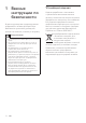1 Важные инструкции по безопасности В данном руководстве содержится важная информация о сетевых фильтрах Philips. Внимательно прочитайте руководство, прежде чем начинать установку и настройку. Предупреждение •• Не используйте сетевой фильтр во влажной среде. •• Не используйте сетевой фильтр, если на поверхность или внутрь фильтра попала жидкость. •• Не разбирайте и не ремонтируйте устройство самостоятельно.