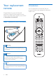 Your replacement remote Congratulations on your purchase, and welcome to Philips! To fully benefit from the support that Philips offers, register your product at www.philips.com/welcome Insert batteries (not included) Warning •• Check the battery polarity when inserting in the battery compartment. Incorrect polarity may damage the product. Caution •• Risk of explosion! Keep batteries away from heat, sunshine or fire. Never discard batteries in fire.