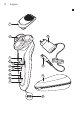English 17 Dry shaving 1 Switch the shaver on. 2 Stretch your skin with your free hand so blades can lift and cut whiskers. Gently press shaver to skin so the floating heads can follow the contours of your face. Note: Do not press too hard. Too much pressure can pinch the skin into the combs. 3 Switch off and clean the shaver after each use.The display lights up for a few seconds to show the battery status.