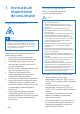 1 Instrucțiuni importante de securitate Siguranța auzului Pericol Pentru a evita deteriorarea auzului, limitați timpul în care utilizaţi căștile la volum mare și setați volumul la un nivel sigur. Cu cât volumul este mai puternic, cu atât timpul de ascultare în siguranţă este mai scurt. Respectaţi următoarele instrucţiuni în timpul folosirii căștilor. • Ascultaţi la un volum rezonabil pentru perioade rezonabile de timp.