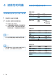 播放時間限制: 其他耳機指示燈狀態 耳機狀態 指示燈 當耳機處於待命模 式時,或當您正在 聆聽音樂時,耳機 連線到藍牙裝置 藍色LED指示燈每 4秒閃爍一次 耳機已準備好進行 配對 LED指示燈快速閃 爍藍色 耳機已開機但未連 接到藍牙裝置 藍色LED指示燈每 3秒閃爍兩次。如 果無法建立連線, 耳機將在5分鐘內 自行關閉 電池電量低 藍色LED指示燈每 分鐘閃爍3次直到 沒電 電池已充滿電 藍色LED指示燈熄 滅 • 可以在Philips Headphones 應用程 式中設定播放時間。 確保您的裝置已與耳機連接,並在 Philips Headphones 應用程式中 設定播放時間。 • 達到預設最高允許音量播放時限前 10 分鐘,語音提示"Playtime limit enabled"「播放時間限制已啟用」。 a) 達到播放時間限制後,將播放語 音提示"Playtime limit enabled"「播放時間限制已開 啟」並且耳機中的音樂將暫停播 放。語音提示"Playtime limit enabled"「播放時間限制已開 啟」將每10秒播放一次,直到 電池電量耗盡。同時