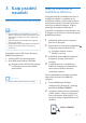 4 Ausinių naudojimas Ausinių prijungimas prie „Bluetooth“ įrenginio 1 Įjunkite mobilųjį telefoną/ 2 „Bluetooth“ įrenginį. Paspauskite ir palaikykite įjungimo/ išjungimo mygtuką, kad įjungtumėte ausines. Mėlynas LED dega 1 sekundę Ausinės automatiškai vėl prijungiamos prie paskutinio prijungto mobiliojo telefono/ „Bluetooth“ įrenginio.