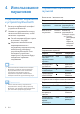 Другие индикаторы состояния наушников Состояние наушников Наушники подключены к устройству Bluetooth, наушники находятся в режиме ожидания или во время прослушивания музыки Наушники готовы к сопряжению Наушники включены, но не подключены к устройству Bluetooth Низкий уровень заряда аккумулятора Аккумулятор полностью заряжен Индикатор Синий светодиод мигает каждые 4 секунды Предел времени воспроизведения: • Время воспроизведения можно настроить в приложении Philips Headphones App.