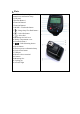 I.Parts 1. indication light: transmission confirmation lamp 2.LCD panel 3.Function Button 3 4. Function Button 2 5. Function Button 1 6.: Flash mode button Radio 7.< >: Charge lamp/Test flash button; 8.< >: Select/Set button 9.< >: Select dial 10.Mounting foot lock lever 11.Battery compartment cover 12.Function button 4 13. < >: Linked shooting button 14.Power button 15.Flash exposure confirmation lamp 16.Lock-release button 17.USB port 18.Remote release terminal 19.Contacts 20.