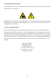 1.4 Sicherheitshinweise für Beschädigungen und Betrieb • Bei einer Beschädigung des Gehäuses oder der Optik des Lasermoduls kann unter Umständen Laserstrahlung einer höheren Laserklasse austreten, die für das Auge gefährlich ist. • Schalten Sie das Gerät nicht ein, wenn eine Beschädigung am Gehäuse der Optik oder der Stromversorgung vorliegt. • Bitte beachten Sie, dass es zur Blendung durch Blick in den Laser kommen kann und der Betriebszustand von Maschinen nicht zweifelsfrei erkannt werden kann, z.B.