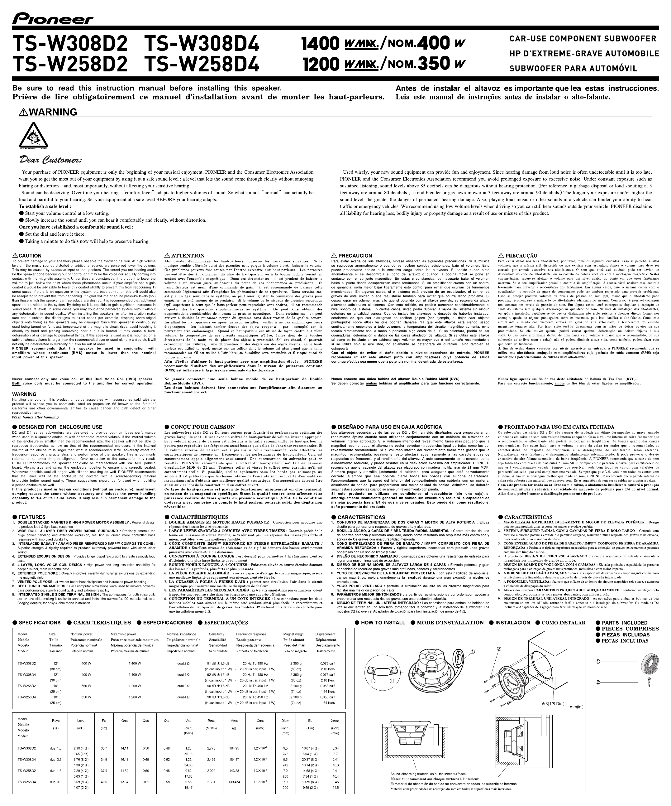 Pioneer Car Use Componet Subwoofer TS-W258D4