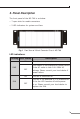 3. Panel Description The front panel of the MC-700 is as below: • 7 open slots for media converters • 2 LED indicators for system and fans Fig. 1 Front View of 10-inch Converter Chassis MC-700 LED indications: Printing PWR FAN LED Status Description ON The chassis is powered. OFF The chassis is not powered or power failure if the AC outlet is with 100~240V AC voltage. Please consult your local dealer if power failure. ON The fan is functional ok.